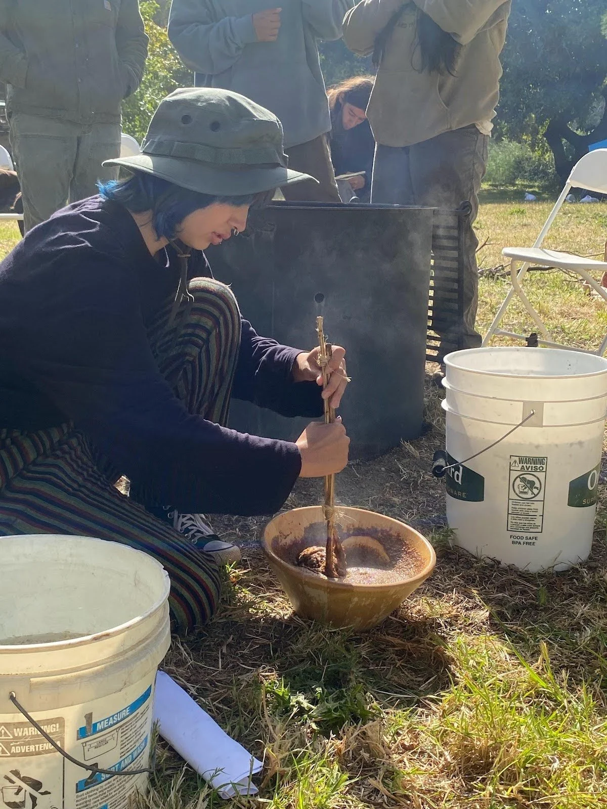 To close out the week, that Friday, everyone participated in making brome seed (Bromus carinatus) pinole with Alex Tabone, California State Park Ranger and naturalist. Interns began by cooking brome kernels by adding them and hot coals into a basket. As the brome seeds began popping from the heat, Alex remarked, “All corn is a grass, and all grasses pop like popcorn!” The charred seeds were placed in a bowl mortar and crushed. The seed chafe was winnowed by wind, and these steps were repeated until a fine earth colored pinole was made. This pinole was added to another basket with water and a heated stone to be stirred until completely cooked.