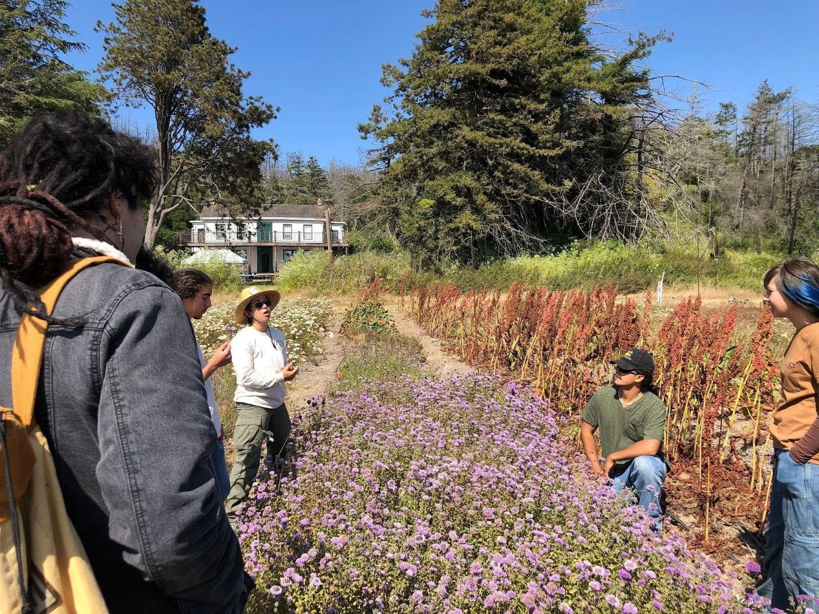 Aylara Odekova, AMLT Native Plant Program Manager, speaking to interns beside a bed of coyote mint (Monardella villosa)